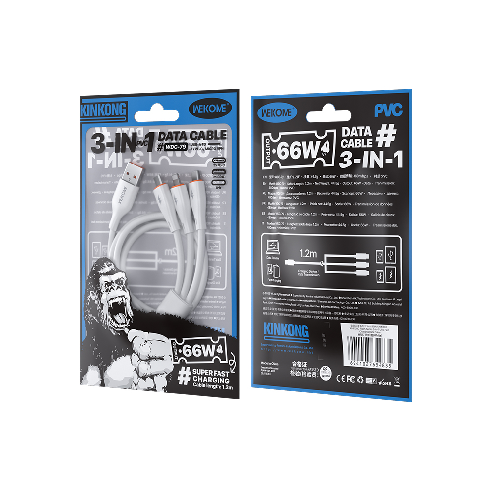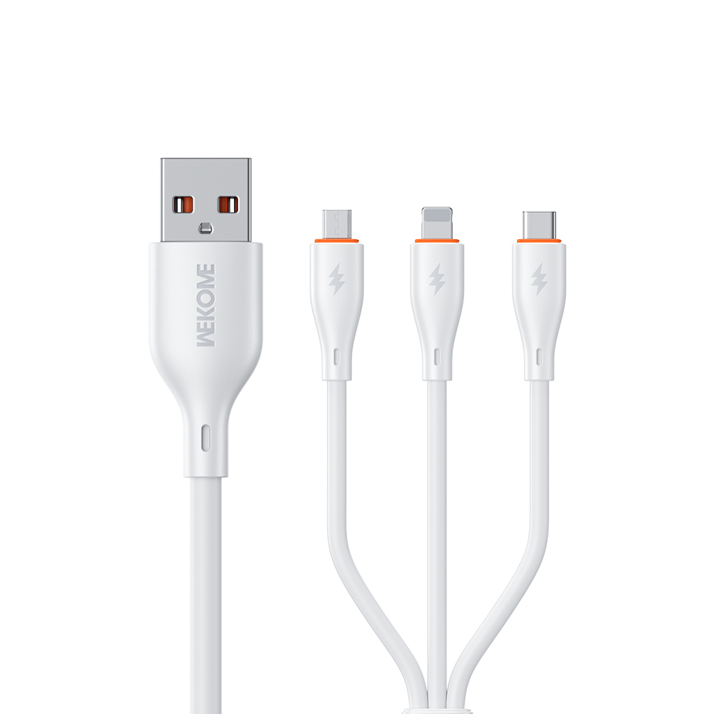 Το WEKOME WDC-79 είναι ένα πρακτικό και ανθεκτικό καλώδιο 3-σε-1 που προσφέρει φόρτιση και μεταφορά δεδομένων για συσκευές με θύρες USB-C, Lightning και MicroUSB – όλα σε ένα.